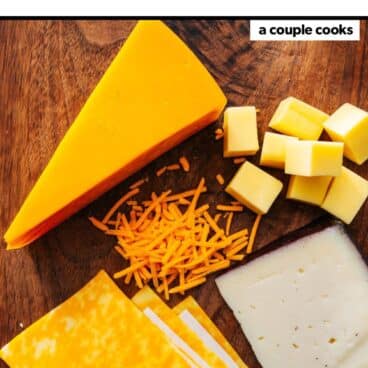 - 1 block hard cheese, shredded cheese, or cheese slices (mozzarella, cheddar, Colby, gouda, Monterrey Jack, provolone, Swiss, Havarti)