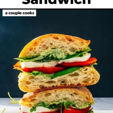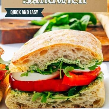 This Caprese sandwich is a stunning crowd pleaser! Layer tomatoes, mozzarella and pesto aioli for a splash of flavor. Got burrata? Go to our Burrata Sandwich!