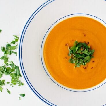 This curried carrot soup is perfect for a lunch or a light dinner along with some bread and a side salad, or a first course for a dinner party. It’s also vegetarian, vegan, and gluten-free, so it fits with many diets. Since it uses carrots, it’s got spring soup written all over it! It’s perfect for spring, though you could serve it in any season.