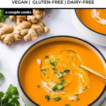 Wow is what you’ll say about the velvety flavor of this soup that tastes like sunshine: our favorite carrot ginger soup! It’s great for using up a big bag of carrots, or when you’re in the midst of a gray season craving sun. Alex and I are usually of the opinion that pureed soups aren’t worth the work since they’re not filling enough to be a meal. But this one is absolutely worth it for the warm and comforting flavor.