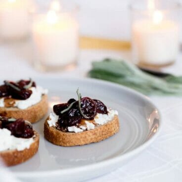 This cherry and goat cheese crostini is perfect for a spread of winter appetizers, be it Thanksgiving, Christmas, New Years, or Valentine’s Day. Here are a few of our favorite winter appetizers: