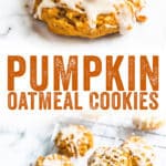 These chewy pumpkin oatmeal cookies taste like oatmeal cream pies! They’re full of pumpkin spices and drizzled with an easy powdered sugar icing.