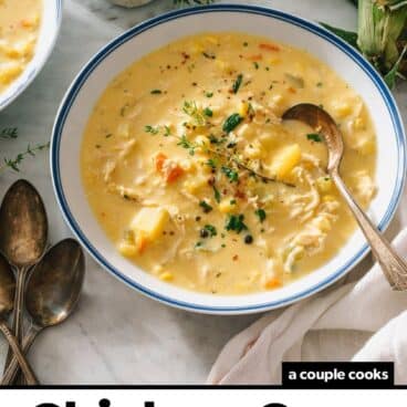 - Vegetarian: Make this Corn Chowder! Or take the recipe below, omit the chicken, and use vegetable broth. You may find you need to add extra salt: you may want to substitute the 2 teaspoons kosher salt with 1 teaspoon kosher salt and 2 tablespoons soy sauce, which adds a nice meaty flavor.