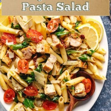 This tangy chicken pasta salad is packed with Mediterranean flavors and is our family-favorite summer lunch or dinner! It’s a mix of tender chicken, sun dried tomatoes, artichokes, Parmesan cheese, fresh herbs, and a zesty vinaigrette.