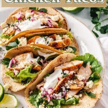 This chicken tacos recipe works grilled, too! We’ve made it both ways and it comes out fantastic. For grilled chicken tacos, preheat a grill to high heat (450 to 550°F). Grill the chicken until grill marks appear and it releases from the grates, 2 to 4 minutes. Flip and cook another 2 to 4 minutes until the internal temperature is 165°F. Remove to a platter and cover with foil. Allow to rest for 5 minutes for maximum juiciness, then slice.