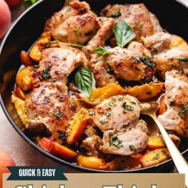 The sweet and savory combination of chicken thighs with peaches makes an over-the-top delicious one-pan meal! This easy dinner idea pairs rich, savory chicken with the juicy sweetness of peaches and a sprinkle of fresh herbs for a bright, aromatic touch.