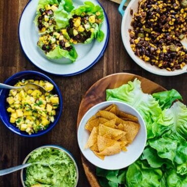 These vegetarian lettuce wrap are so delicious with homemade guacamole and mango salsa! It can take a bit of time to prepare all of the components at home. The prep time for the lettuce wraps below does not include the mango salsa and guacamole, so make sure to plan accordingly. If you don’t have that kind of time prior to serving, do the following: