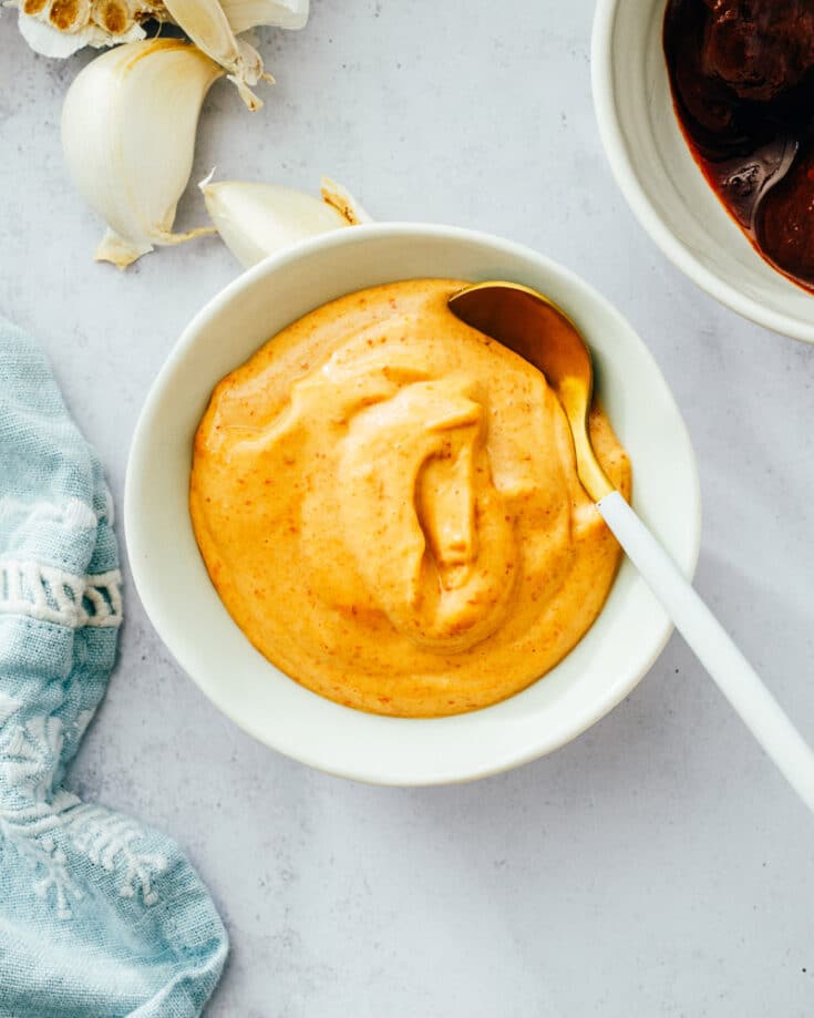 - In a medium bowl, stir together 2 tablespoons of the mashed chipotle peppers with the grated garlic, mayonnaise, cumin, and kosher salt. (Taste and if desired, you can add more chipotle for an even spicier kick.)