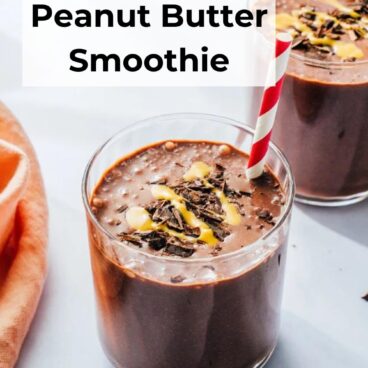 Serving this chocolate peanut butter smoothie as a treat? Top it with a sprinkle of dark chocolate! You only need about 1 tablespoon, and when you stir it in it makes for tasty chocolate chunks in each sip. It’s optional, but a fun way to take it up a notch! Then add a drizzle of peanut butter to take it over the top.