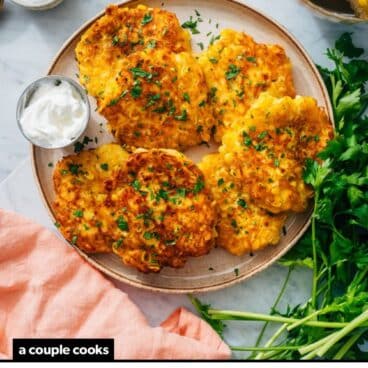 - Remove and place on a a baking rack to cool slightly (so they don’t become soggy on the bottom). Immediately sprinkle with a bit of flaky sea salt (or more kosher salt) to allow the flavor to pop and if desired, garnish with parsley and serve with sour cream, aioli or another dipping sauce. Finish cooking the remaining batches of the fritters. Serve immediately. The fritters are best the day they are made, but you can store leftovers refrigerated for 1 to 2 days if desired and reheat them in a pan with a drizzle of oil before serving.
