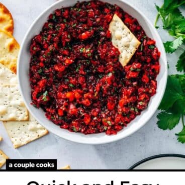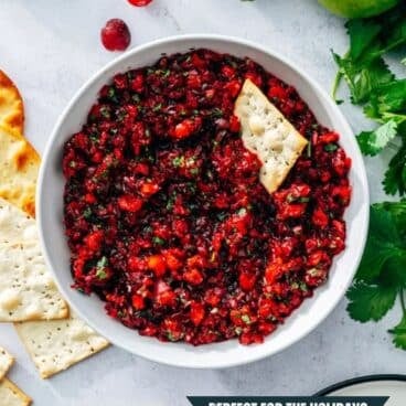 Once you’ve got your cranberry salsa, there are lots of ways to serve it! It’s a great for fall and winter, ideal as a Thanksgiving appetizer or a Christmas appetizer. This one works with more than just chips: it’s great as a dip with any sort of cracker. Try this recipe served with: