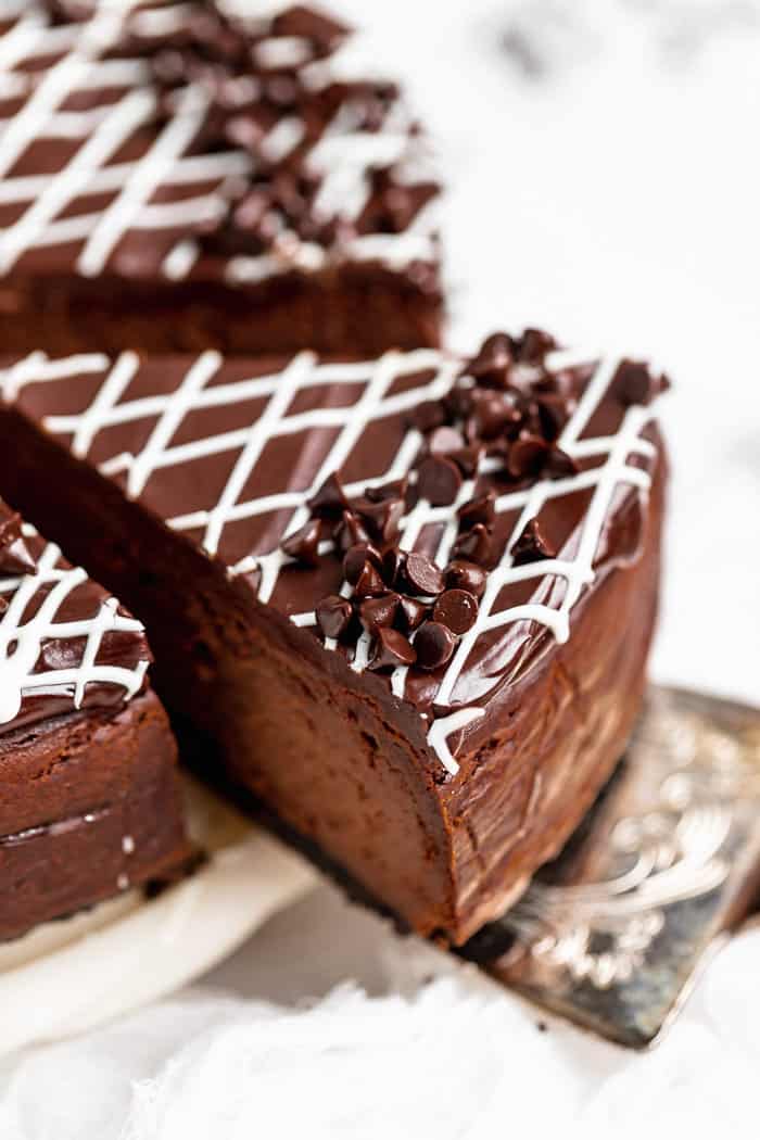 Packed with chocolatey goodness four times over, this Chocolate Cheesecake is a chocolate lover’s fantasy! This recipe features a chocolate graham crust, a fudgy cheesecake filling and both a white and regular chocolate glaze. via Grandbaby Cakes