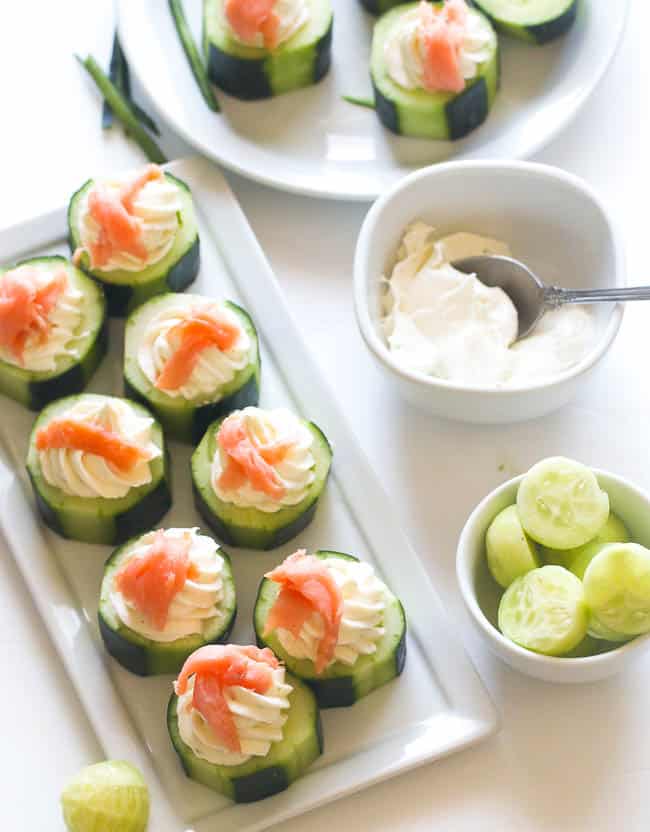 Turn cream cheese into an appetizer with these Smoked Salmon Bites! Combine cucumber, cream cheese and smoked salmon into easy-to-eat finger food. They're no bake and elegant. via Immaculate Bites