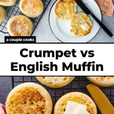Crumpet vs English muffins: what’s the difference? These two small, round breads are about the same size and use similar ingredients, but have some major differences. Are they both cut in half? Are they both English? Here’s what you need to know about these popular breads — and a few recipes to try making at home!