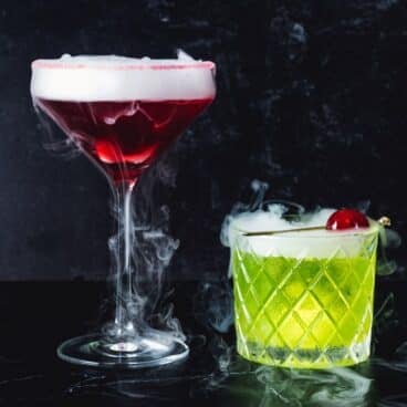 Looking for an impressive neon dry ice cocktail? Try the Witches Brew! Its neon green color might look menacing. But take a sip and it’s bright and sweet tart, with flavors of melon and citrus. Adding dry ice makes the brew bubble and boil, with a magic smoke that wisps into the air!