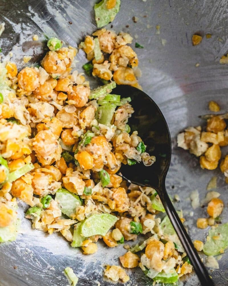 - Combine the chickpeas with the chopped celery and green onions, mayonnaise, lemon juice, and celery seed.