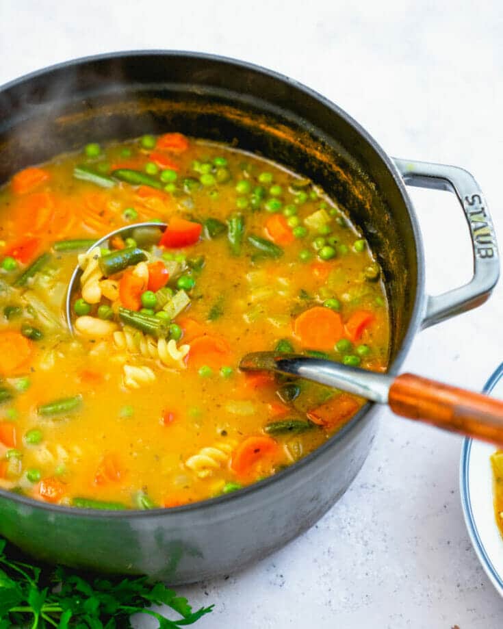 The Dutch oven is perfect for soups of all kinds! This vegetable soup is loaded with colorful veggies and cozy spiral past, swimming in a bright yellow turmeric broth with tons of flavor. It’s like canned soup, but a homemade version that tastes infinitely better.
