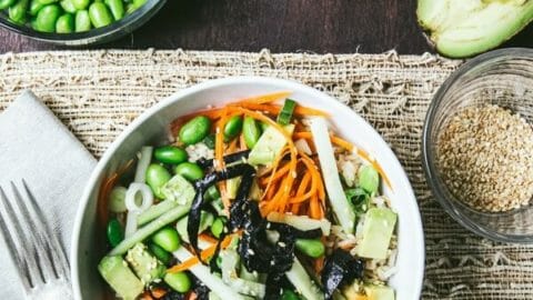 Eat deconstructed sushi with this sushi grain bowl! Top sushi rice with veggies and a soy dressing.