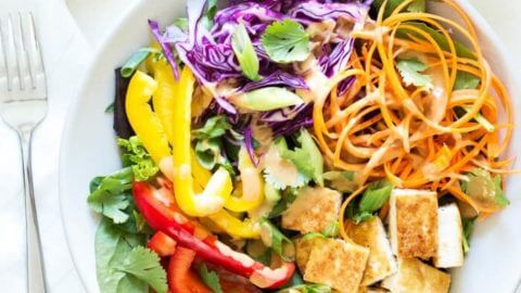 Add rice to this Thai-style grain bowl with creamy peanut sauce dressing!