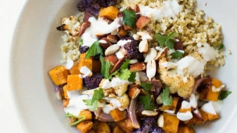 Want to make a grain bowl? Bowl meals are so popular these days, and often they’re on our table because it’s one of the easiest ways to turn random ingredients into a healthy dinner! But here’s the thing: you can’t just throw anything into a bowl. A good grain bowl has to be well-seasoned, and play up contrasts in color, texture and flavor. It’s got to have enough protein to keep you full, and a great sauce to bring it all together. Yes, there are rules to grain bowls! (Kind of.) We’ll talk you through a few steps, and then show you our favorite grain bowl that makes a fast and easy dinner in 30 minutes.