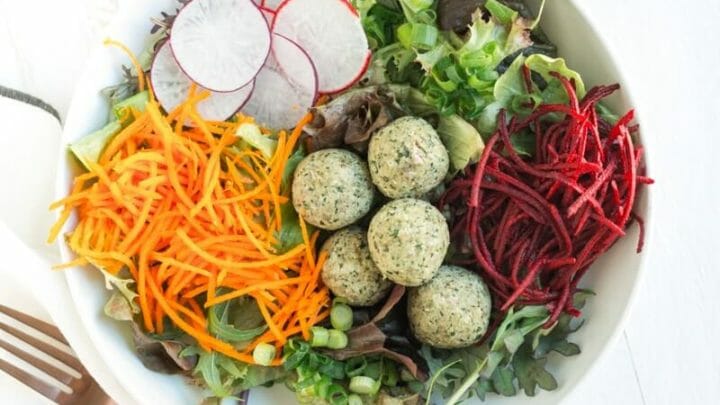 This bowl is topped with raw falafel balls and tahini sauce! Add quinoa or rice to make it a grain bowl.