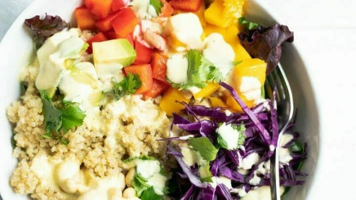 This quinoa grain bowl features ripe mango, cashews, and a zingy orange ginger drizzle.