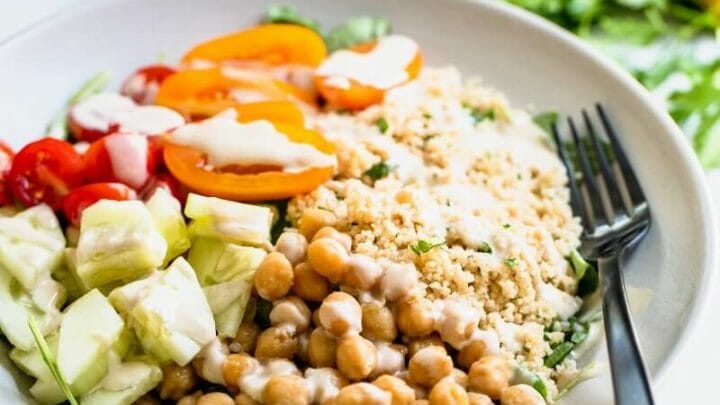 - Mediterranean style: That’s the style of this easy grain bowl! It’s got Mediterranean or Greek style elements like tahini sauce, chickpeas, cucumber and tomatoes.
