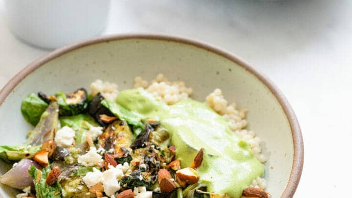 This Moroccan style bowl has a lemon yogurt drizzle and a unique grain (freekah).