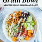 This easy grain bowl is Mediterranean-inspired and takes just 30 minutes to make into a healthy lunch or dinner! Because some grains can take longer to cook, this concept can often take longer than 30 minutes if you make them all at once. This recipe is quick and easy! Make it even faster with our make-ahead tips below. It’s a plant based and vegan quinoa recipe that’s great for weeknight cooking. Here are the elements that make this grain bowl so quick: