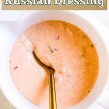 So what is Russian dressing? Russian dressing is an American dressing made of mayonnaise, ketchup, and a few other savory ingredients. It’s the main condiment on a Reuben sandwich, which is its claim to fame. Of course as you might expect, there is nothing Russian about it! It was invented in the early 1900’s in America.