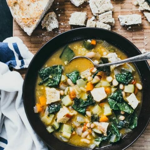 Ribollita is an Italian vegetable stew traditionally thickened by bread as a way to use up old crusts going stale. It’s gently simmered so that the flavors meld together beautifully. The crusty bread cubes are almost like dumplings when soaked in the savory broth.