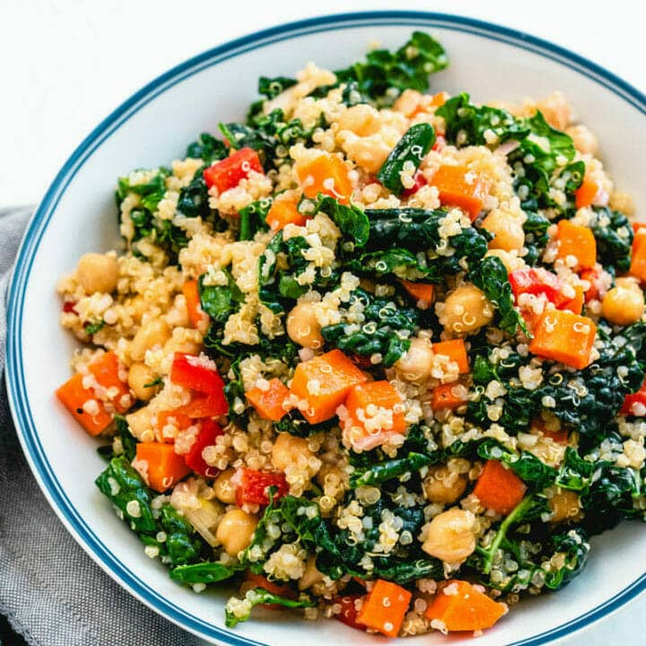 This kale quinoa salad is perfect for a healthy lunch or side dish! It's easy to make and stays good in the refrigerator for days. Tuscan kale leads a list of nutrient-dense ingredients like chickpeas, bell peppers, carrots, and quinoa, and they're covered in a tangy dressing.