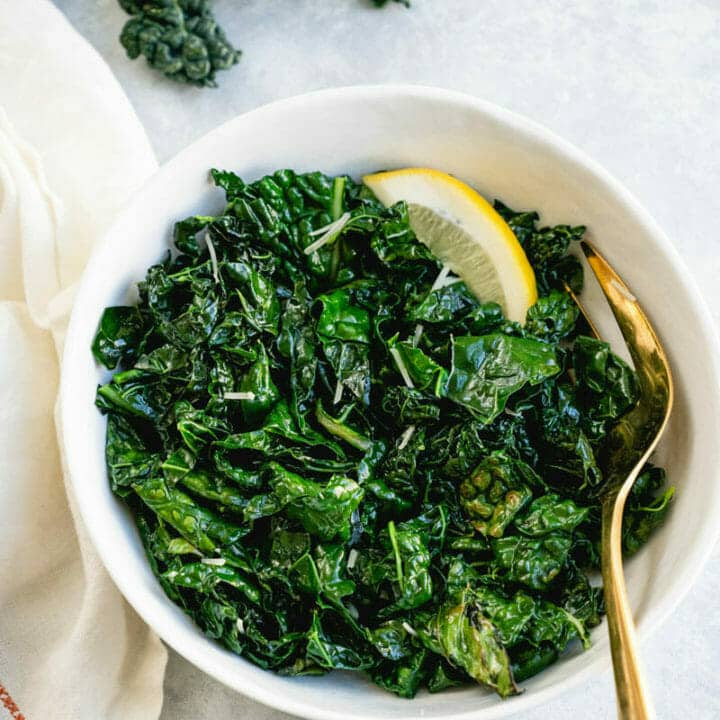 One of the reasons Alex and I have been making this Tuscan kale on repeat is that it’s so easy. Tuscan kale takes only 3 minutes to cook! There are a few tricks to this recipe that take the flavor the top. Here’s how to make sauteed kale in under 10 minutes (or jump to the full recipe below):