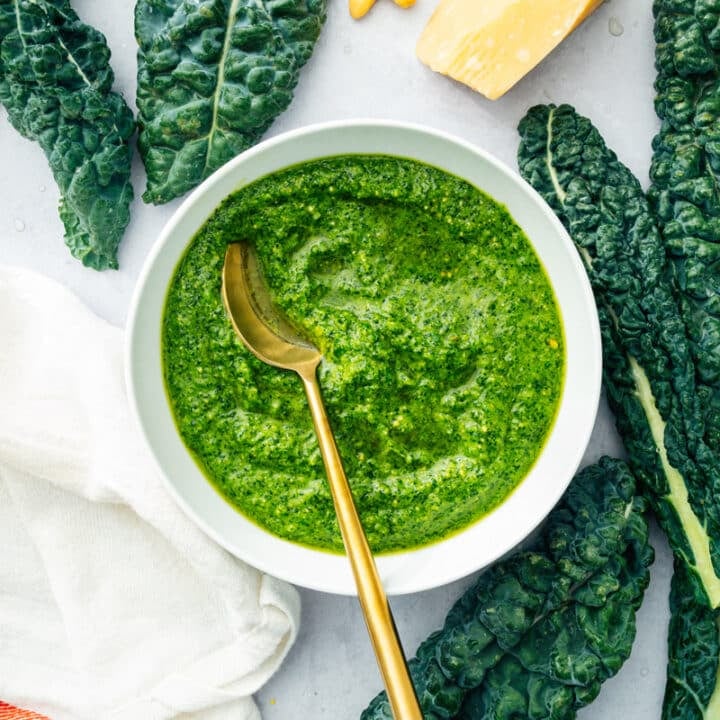 Did you know you can use Tuscan kale to make…pesto? Try this irresistible Kale Pesto! Whiz that leafy green with Parmesan cheese, garlic, nuts and olive oil, and it makes a savory bright green puree with a spicy kick.