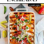 This vegetarian enchiladas recipe is fast and easy: a total crowd pleaser! The simple pinto bean and cheese filling is full of flavor.
