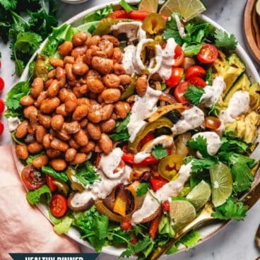 This fajita salad recipe is one of our our go-to dinner ideas, bursting with charred vegetables and covered in a creamy salsa ranch dressing! We eat it often and it works for almost any diet: it’s easily gluten-free, vegetarian, or vegan—plus it’s ideal for serving a crowd!