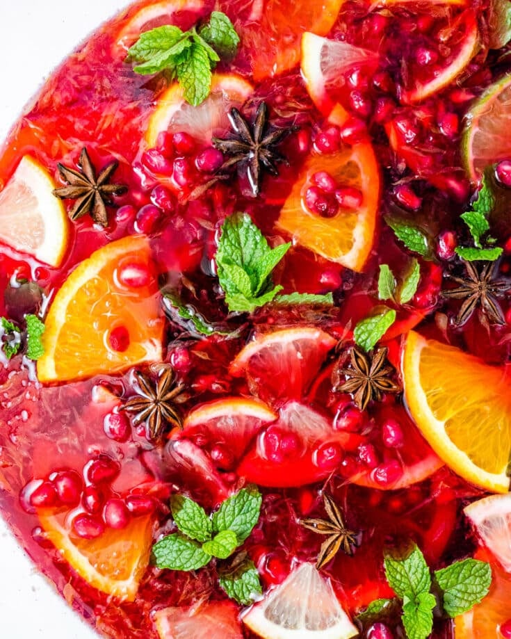 This punch is ruby red and absolutely stunning! It works great for crowds and can easily be made non-alcoholic. The maple syrup brings subtle sweetness, and pomegranate seeds floating on top look beautiful. This is my pick for parties!