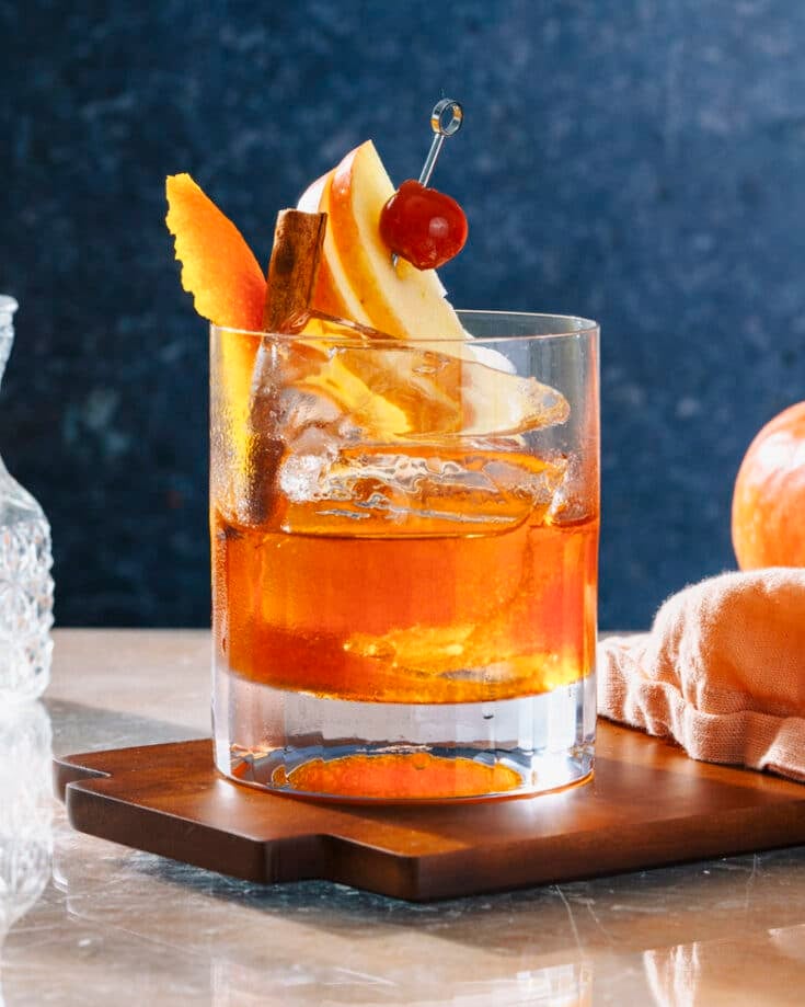 Swapping out the sugar for apple cider syrup in a classic Old Fashioned infuses fruity, spiced seasonal flavor into this classic drink. Each sip has notes of apple and orange, cinnamon and spice, and vanilla and oak. This one is great if you love spirit-forward drinks!