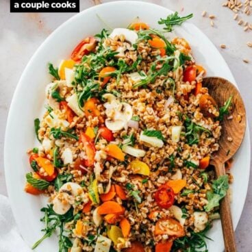 Need a killer side salad or a fun lunch salad? Here’s a recipe that works as both: this Hearty Farro Salad! Farro is an ancient grain with a chewy texture and nutty flavor that’s burst on the scene in the past few years. It’s great as a side dish seasoned with garlic and herbs, but it’s also ideal for grain salads. This one is our new ultimate, pairing the whole grain with juicy tomatoes, earthy mushrooms, feathery arugula, savory pops of cheese, and a zingy vinaigrette.