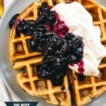 These fluffy blueberry waffles are everyone’s favorite! Topped with a quick blueberry sauce, they’re brunch perfection on a plate.