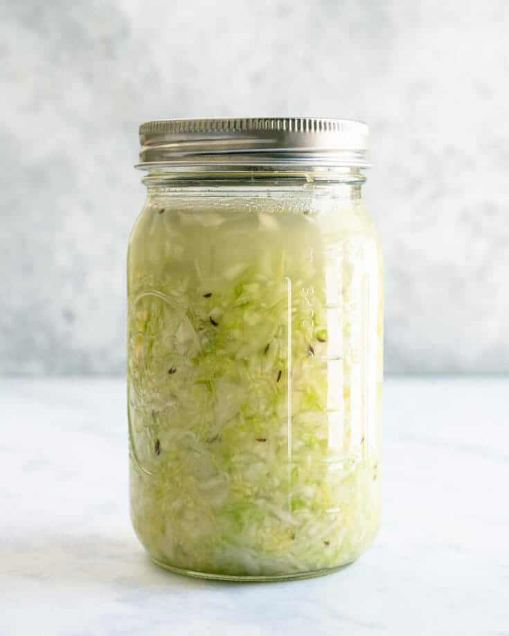 Canned sauerkraut vs fresh: The canned or shelf-stable sauerkraut you find at the store does not contain probiotics, because they’re killed in the canning process! Making homemade sauerkraut recipe guarantees you’ll get those live probiotics right into your jar.