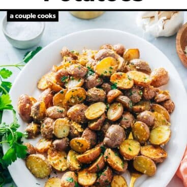 Made as written, this recipe is gluten-free and vegetarian. Want to make vegan garlic roasted potatoes? The Parmesan cheese isn’t required. Simply omit the Parmesan and use vegan butter in place of the butter.