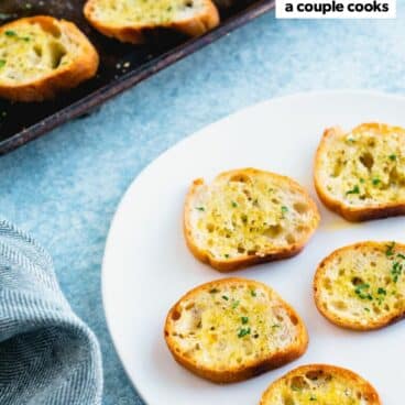 It pairs fresh garlic, dried garlic and olive oil for a huge burst of garlicky flavor on a crunchy toasted baguette. It’s full of flavor without the need for cheese: great for if you eat plant-based or don’t it on hand in your fridge. Here’s how to make it!