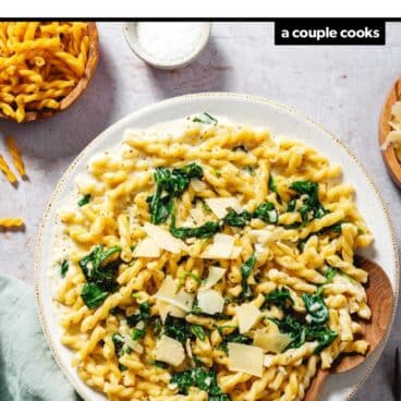 Here’s our favorite way to serve it: smothered in a rich, garlicky Parmesan cream sauce. Tender spinach wilts into the mix, adding a pop of color and dose of vegetables. It’s creamy, cheesy, and oh-so-satisfying in just 20 minutes!