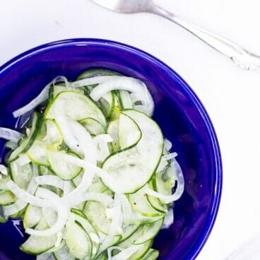This refreshing German cucumber salad (gurkensalat) is a summer tradition: thinly sliced cucumbers and onions in a vinegary dressing.