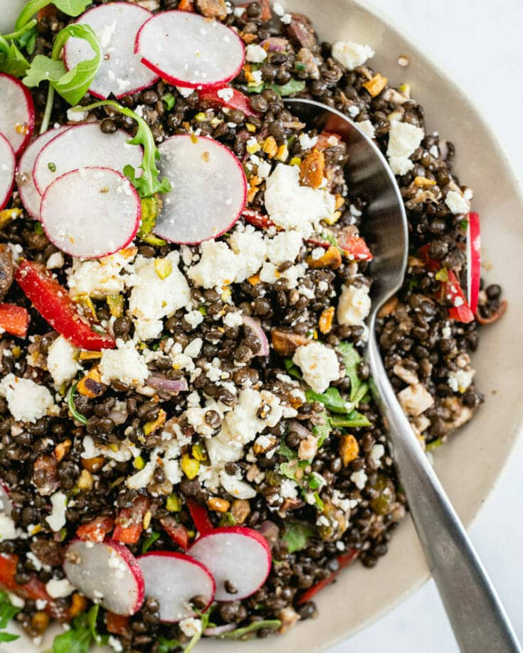 This fresh and healthy lentil salad is Mediterranean-style, mixed with fresh veggies, feta cheese and pistachios. It’s a deliciously protein-packed and it just gets better in the fridge. Make a big batch to eat off of for healthy and easy lunch recipes all week.