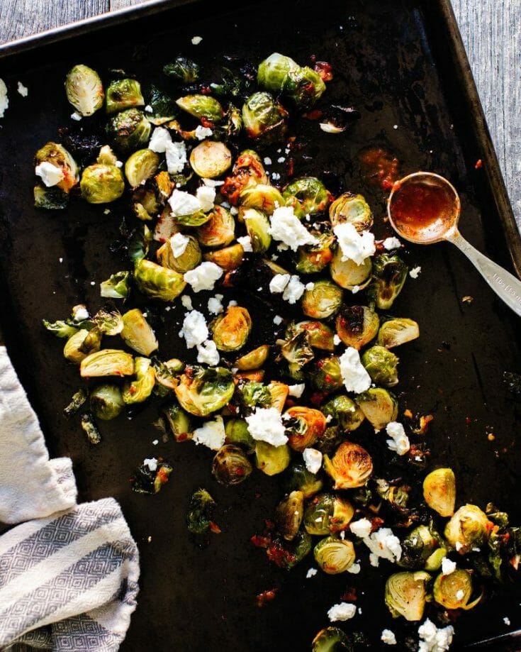 Goat cheese on Brussels sprouts? Why not! These are roasted in a very hot oven so that they become blackened and crisp. Dollop with mild harissa, a North African red pepper sauce that adds big flavor. Then of course crumble over chunks of creamy goat cheese. These days, Brussels sprouts are seeing a big comeback in popular opinion: this is one of the most delicious ways to eat them!