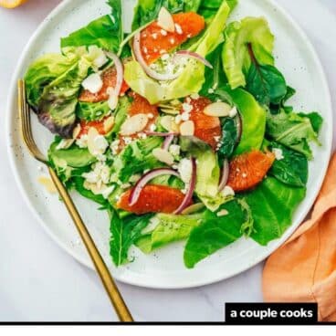Grapefruit salad can be made in a myriad of ways: this one is a simple mix of greens, nuts, cheese, and a zingy vinaigrette. It’s ideal as a side salad for weeknight meals or festive occasions, and you can also add protein to make into a main dish salad (more below). Here’s what you’ll need for this recipe: