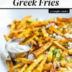 - Transfer fries to a platter and top with the feta cheese crumbles, breaking larger chunks into small pieces with your fingers. Add the finely chopped parsley and red onion. Serve with lemon wedges and tzatziki or lemon dill sauce.