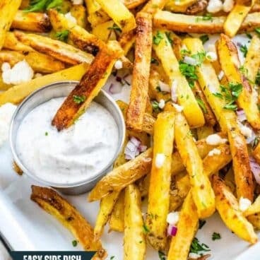 These crispy Greek fries are the ultimate side dish! They’re showered with Mediterranean-style toppings: feta cheese, onion, and herbs for a major upgrade to that side of fries.